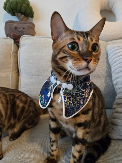 The Auspicious Knot Silk Pet Bandana draws inspiration from traditional decorative knots found across East Asian cultures. Often crafted in intricate, endless forms, these knots symbolize continuity, harmony, protection, and enduring good fortune. With no beginning and no end, the design represents longevity and the interconnected flow of life, making it a meaningful emblem for new chapters and joyful celebrations.