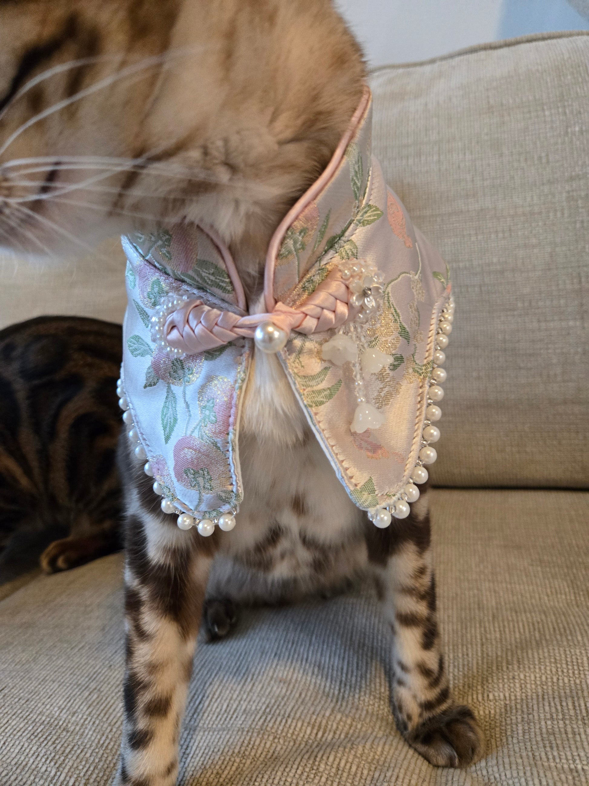The Auspicious Knot Silk Pet Bandana draws inspiration from traditional decorative knots found across East Asian cultures. Often crafted in intricate, endless forms, these knots symbolize continuity, harmony, protection, and enduring good fortune. With no beginning and no end, the design represents longevity and the interconnected flow of life, making it a meaningful emblem for new chapters and joyful celebrations.