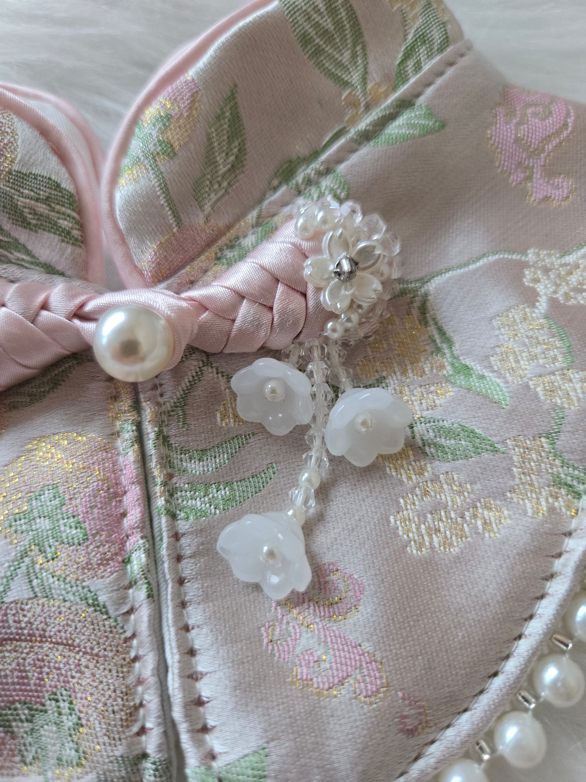 Crafted from luminous silk brocade, this bandana carries a soft sheen that reflects light beautifully. Delicate pearl trim frames the silhouette with quiet elegance, while the statement knot detail at the neckline anchors the piece with ceremonial grace and intention.