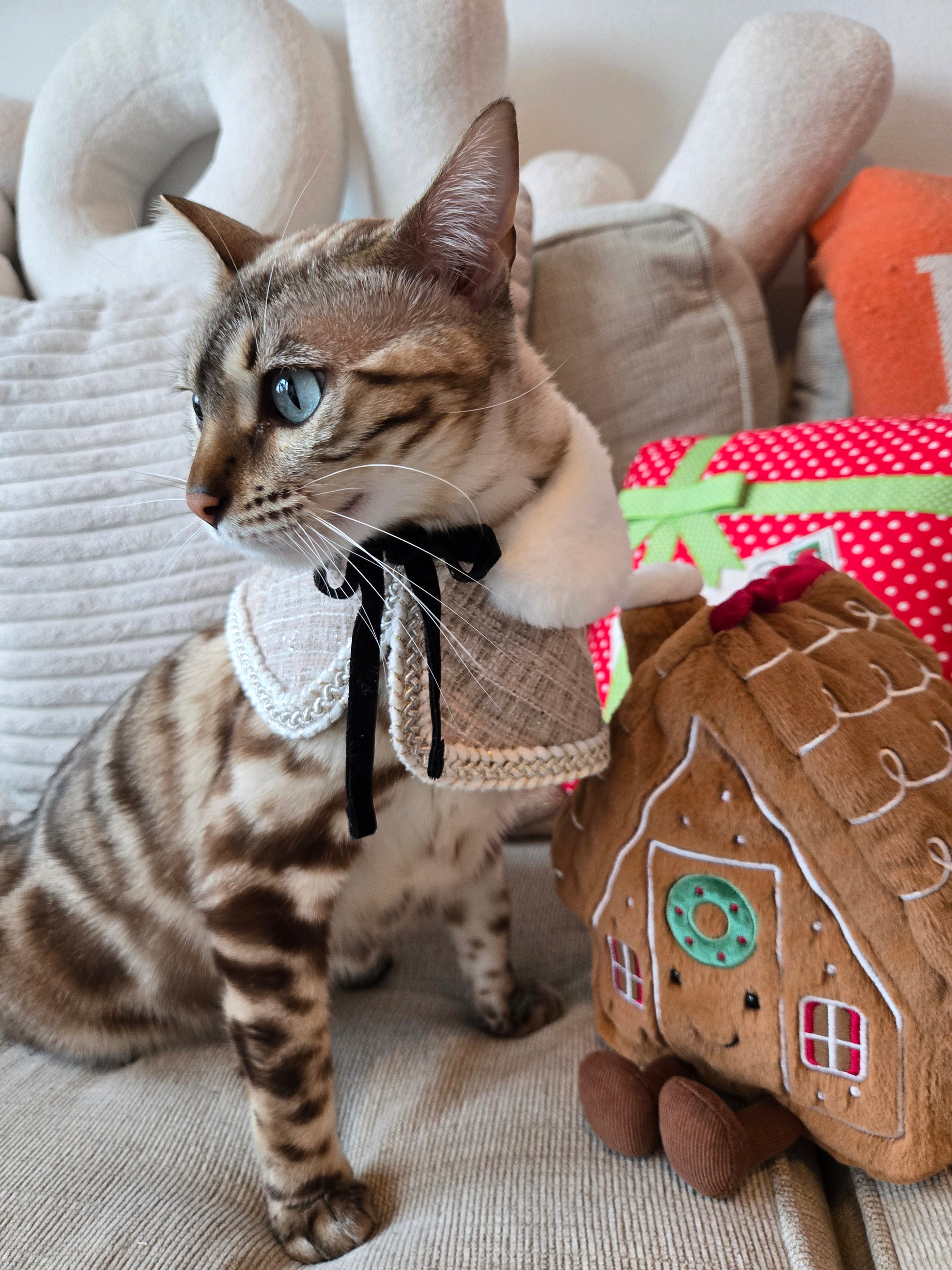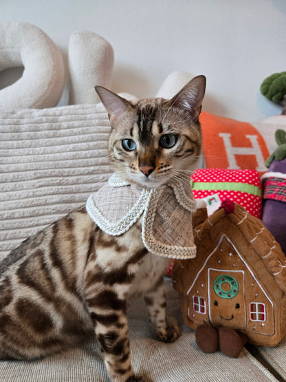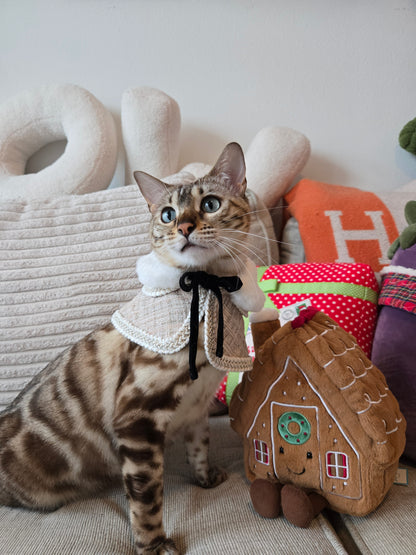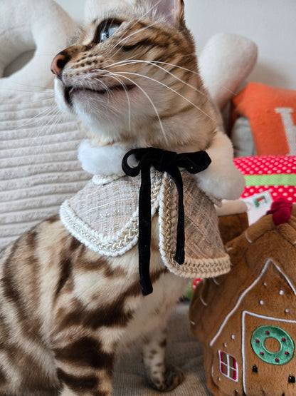 Crafted from shimmering cream-gold tweed with intricate braided trimming, the cape embodies the elegance of a winter ballroom. Its layered silhouette moves beautifully with every step, creating a refined and graceful look fit for a pet of true socialite status. Think: Paris couture house meets Alpine gala.