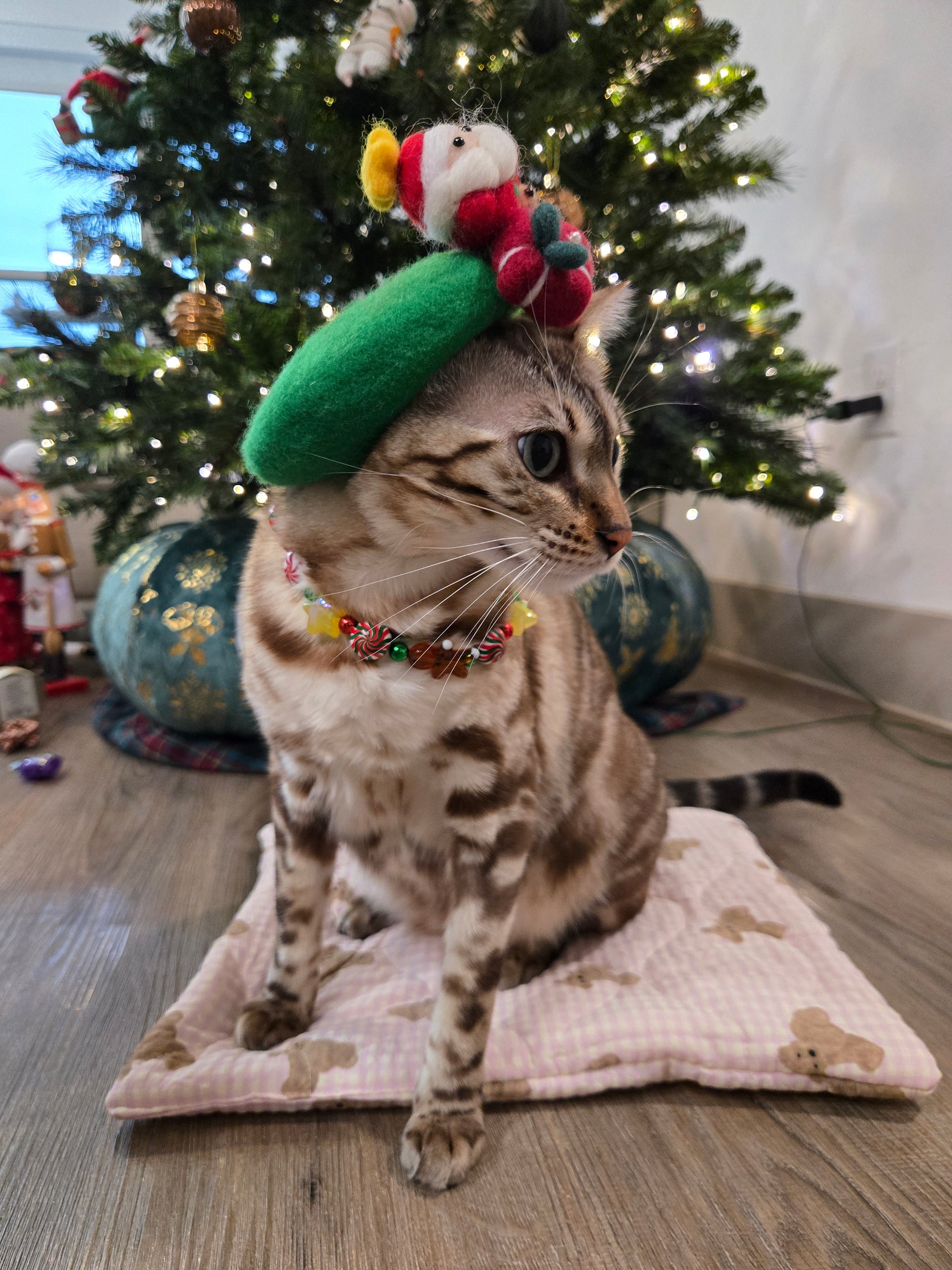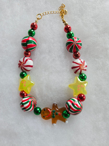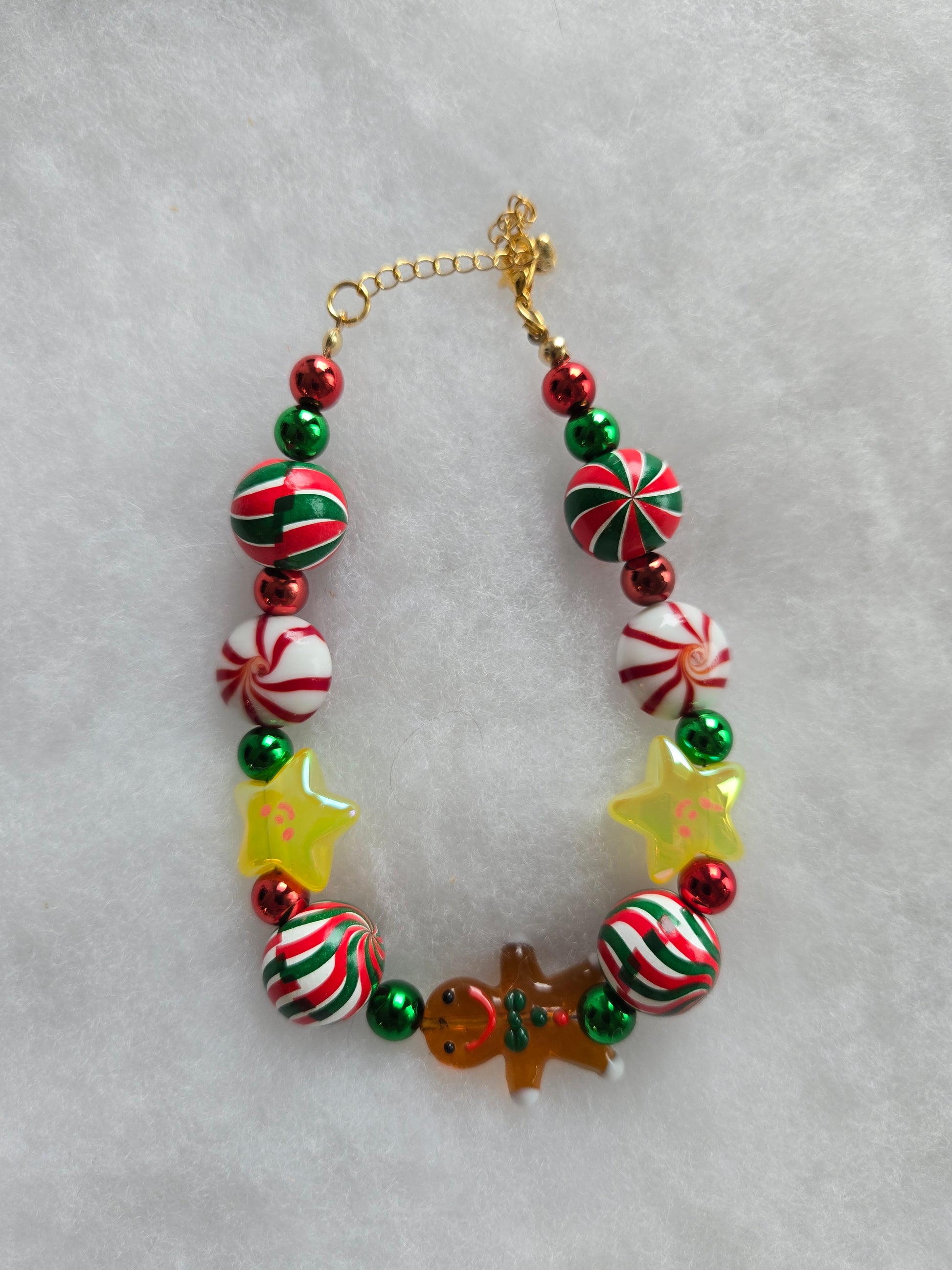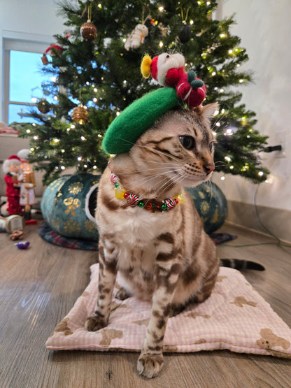 This playful necklace features a joyful mix of peppermint swirls, gumdrop beads, jingle-bell greens, and a tiny gingerbread charm, capturing the exact feeling of wandering through a Christmas market with warm cocoa in hand. Each bead is carefully selected to bring a burst of color and holiday cheer, creating a look that’s both whimsical and cozy for your fur baby.