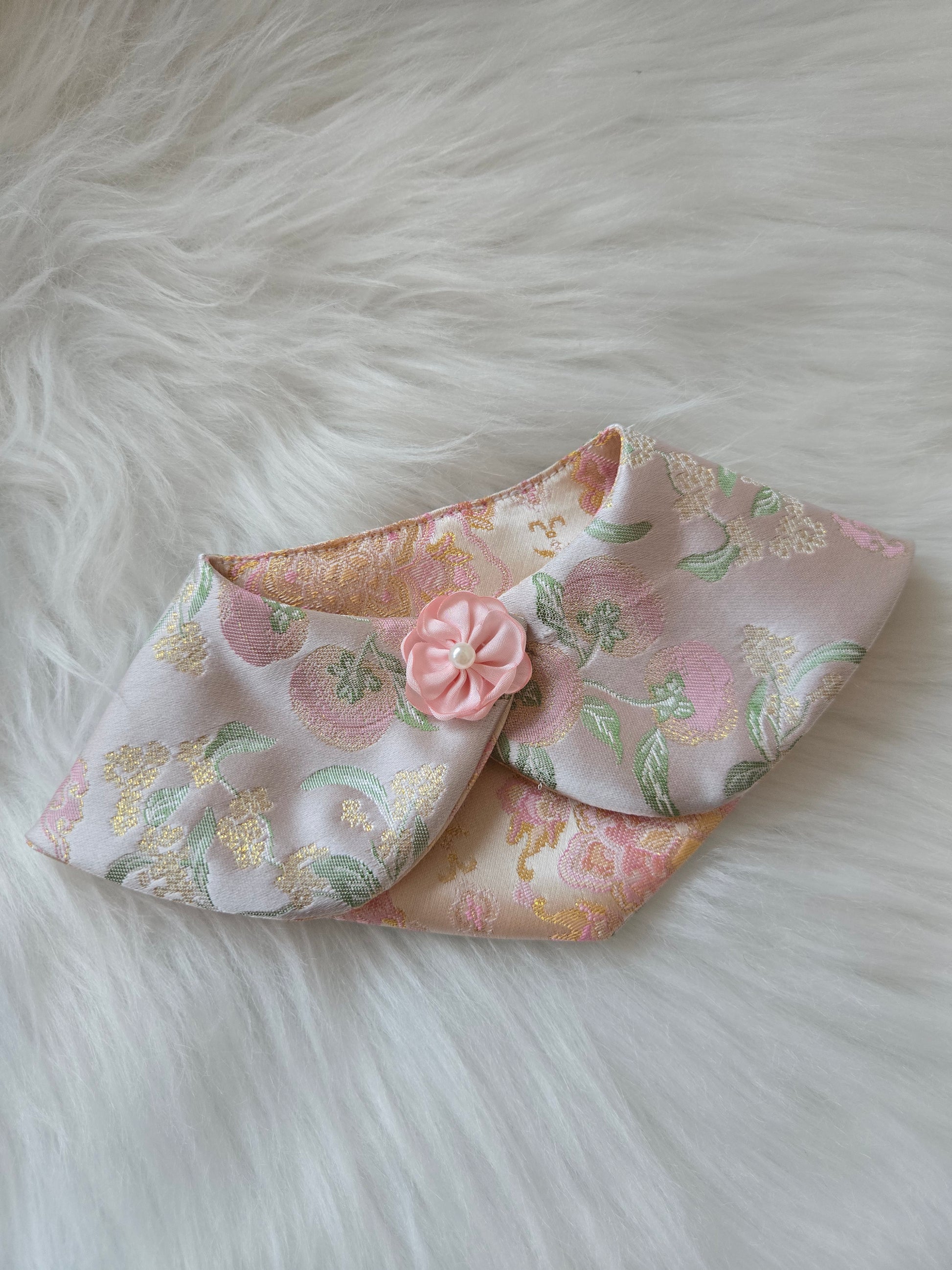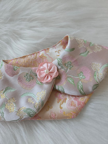 Designed for versatility, this bandana features a four-way wear design, offering multiple ways to style and reveal different sides of the brocade. Each fold unveils a new garden moment, allowing your little muse to bloom in more than one way.