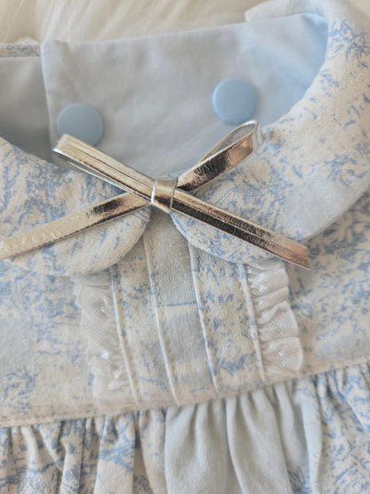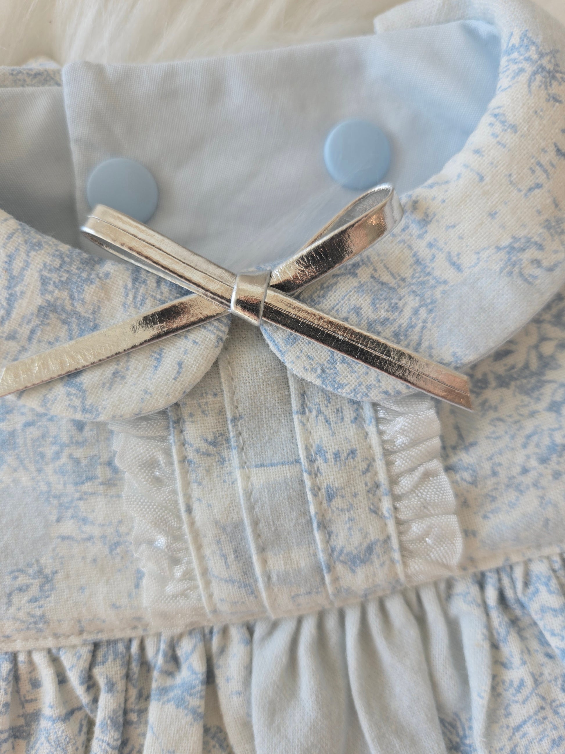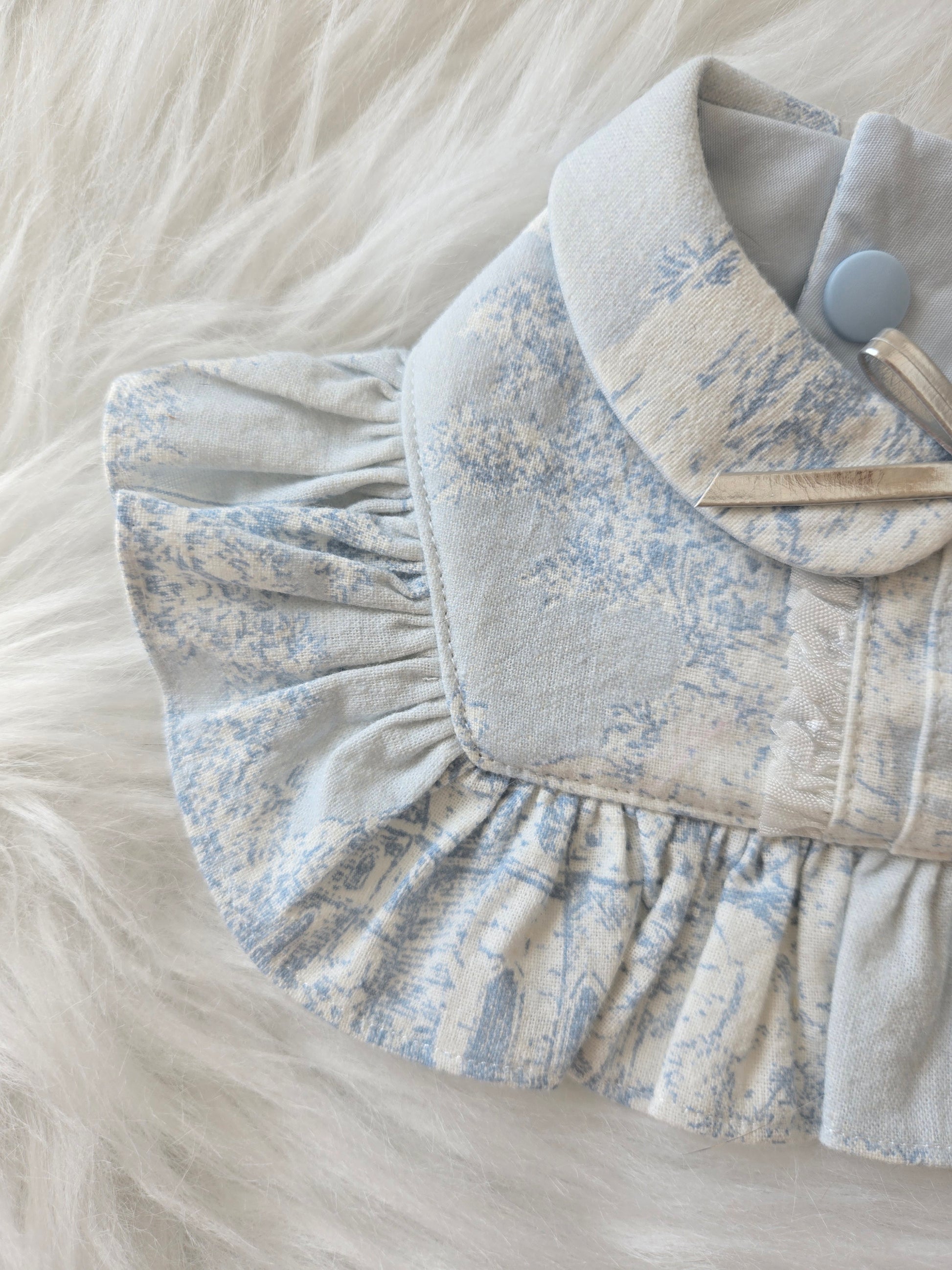 Crafted in a delicate blue toile-inspired fabric, this piece features a structured collar, subtle pleating, and a soft ribbon detail that rests like a quiet finishing touch. The airy silhouette drapes beautifully, creating a look that feels both refined and effortlessly light.