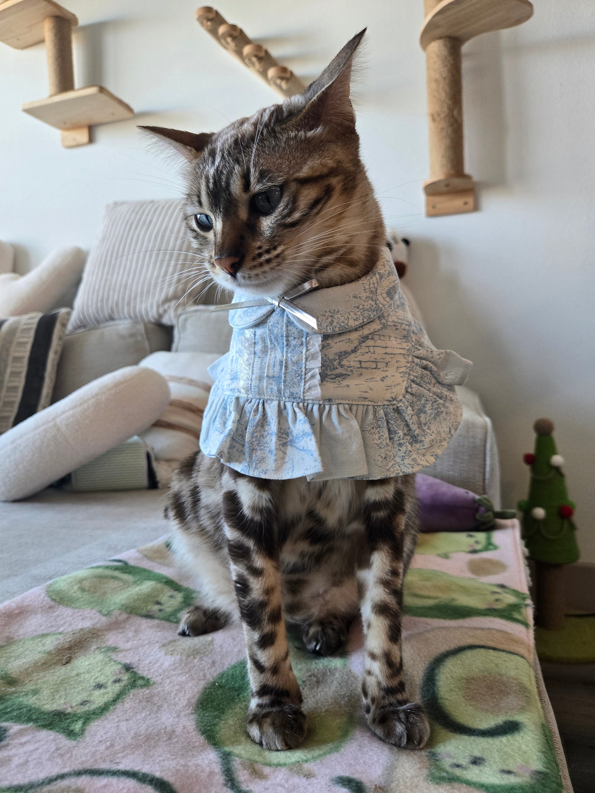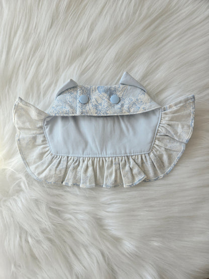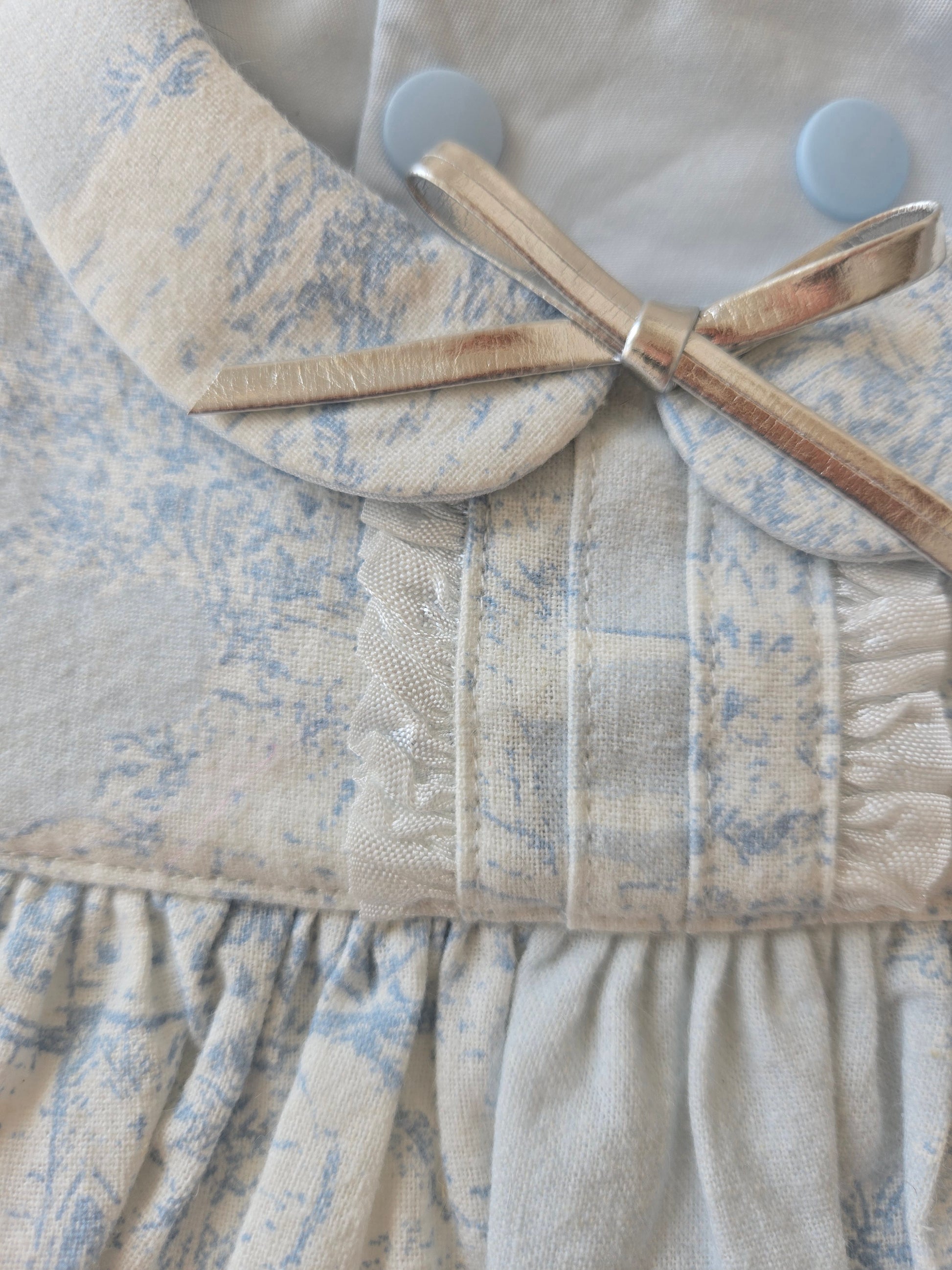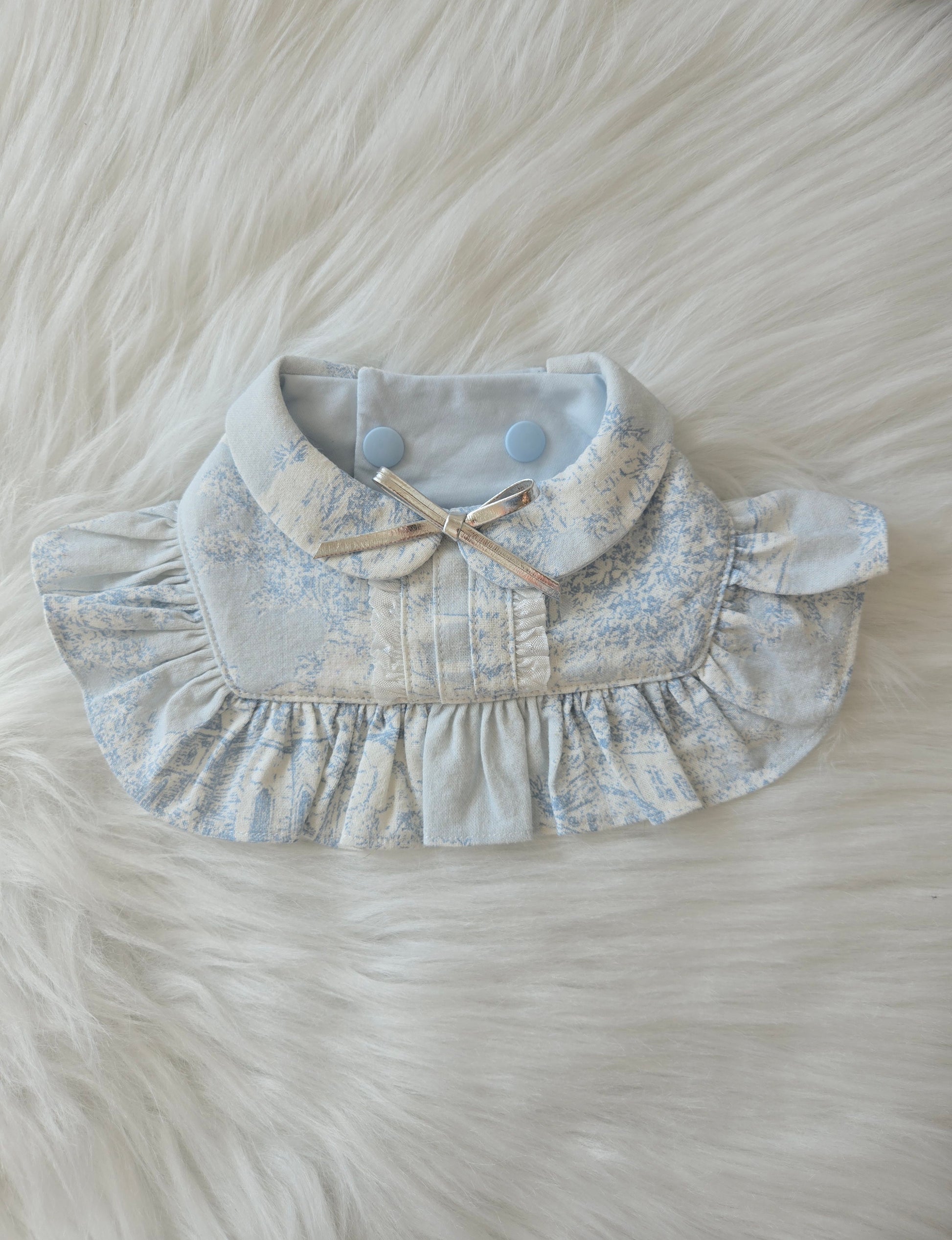 Crafted in a delicate blue toile-inspired fabric, this piece features a structured collar, subtle pleating, and a soft ribbon detail that rests like a quiet finishing touch. The airy silhouette drapes beautifully, creating a look that feels both refined and effortlessly light.