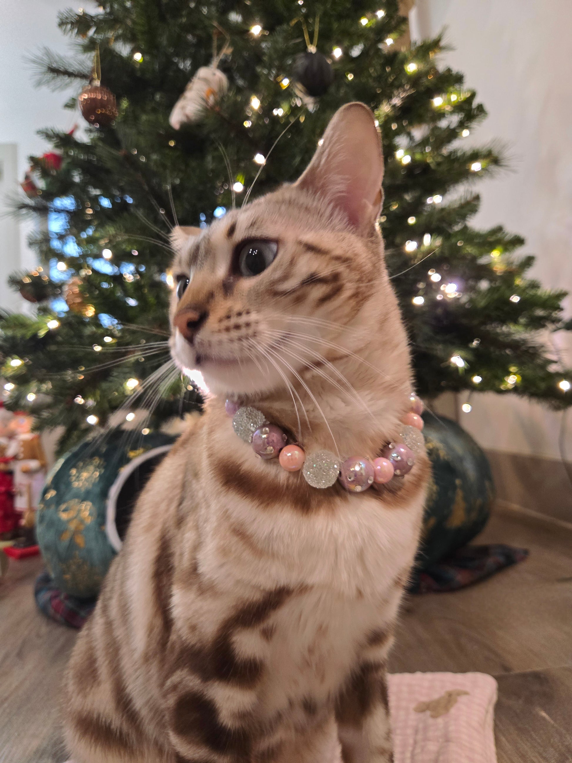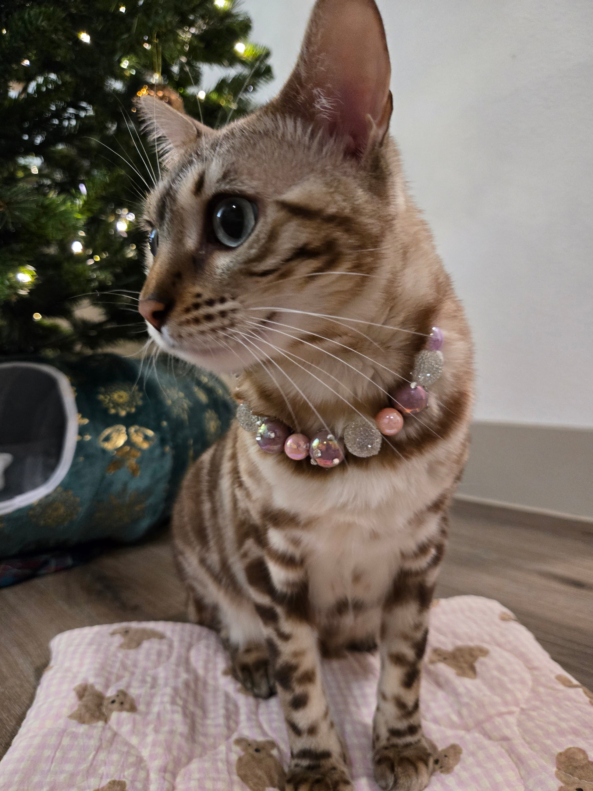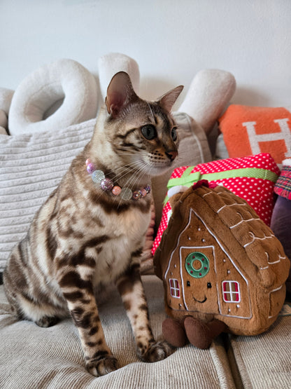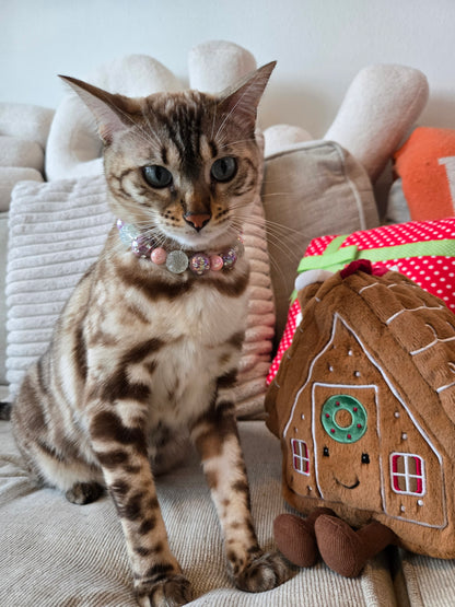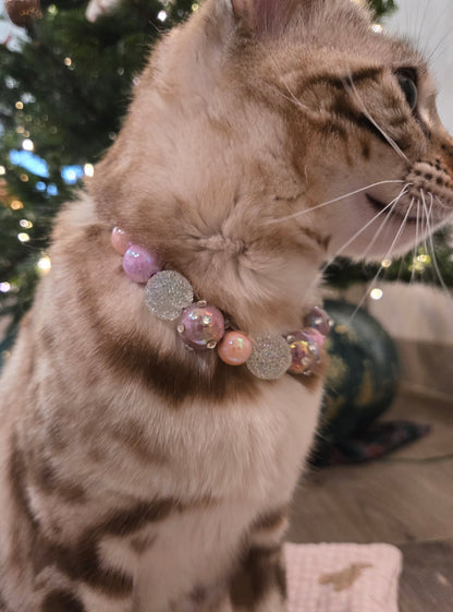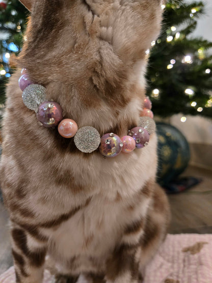 Inspired by glamorous NYE soirées and shimmering Swarovski jewels, this necklace features a dreamy mix of iridescent pastel beads, frosted crystal spheres, and faux diamond accents that catch the light with every elegant head tilt. It’s giving midnight champagne toast… but make it kitty couture.